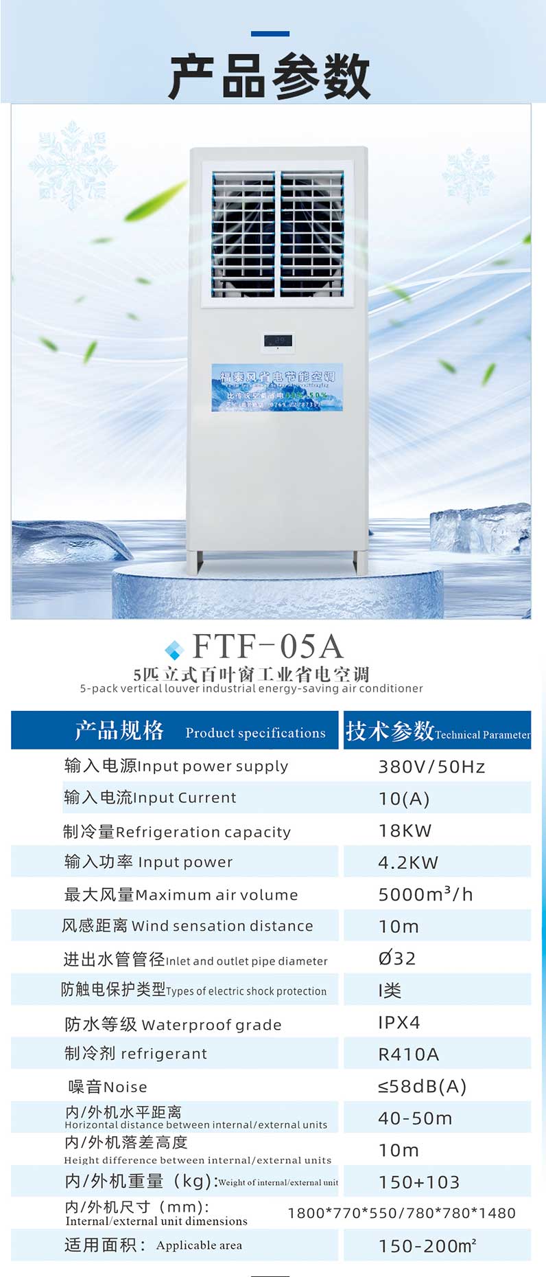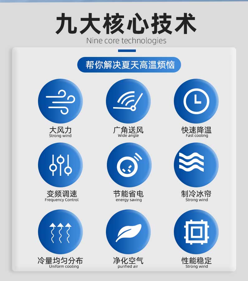 .節能省電、同等面積安裝比傳統空調省電30~50%,覆蓋面積大一臺5P的可以覆蓋200個平方車間降溫,出風口溫度可以做到13-16度。車間溫度可做到20-26度適合人體體感溫度。